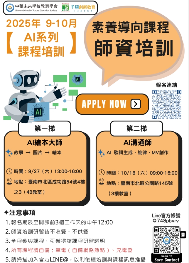 2025年9至10月千碩教育AI系列教師增能研習活動第一二梯現正報名中,誠邀本校師生踴躍報名參與!