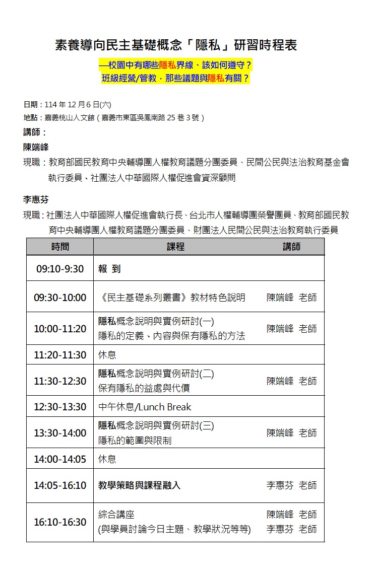 三、為推廣《民主基礎系列》教材、精進教師在人權教育議題及法治教育議題融入學習領域的教學素養與能力,特於114年12月06日(六)於嘉義市「桃山人文館」辦理民主基礎教材系列「隱私」之研習活動(活動免費,研習地址:嘉義市東區吳鳳南路25巷3號)。研習活動訊息可參考以下網址https://www.lre.org.tw/news/2331,並自即日起於本會官網開放報名(官網報名網址https://reurl.cc/Ln8EVy、或是透過全國教師在職進修網查詢報名,課程編號:5280406。