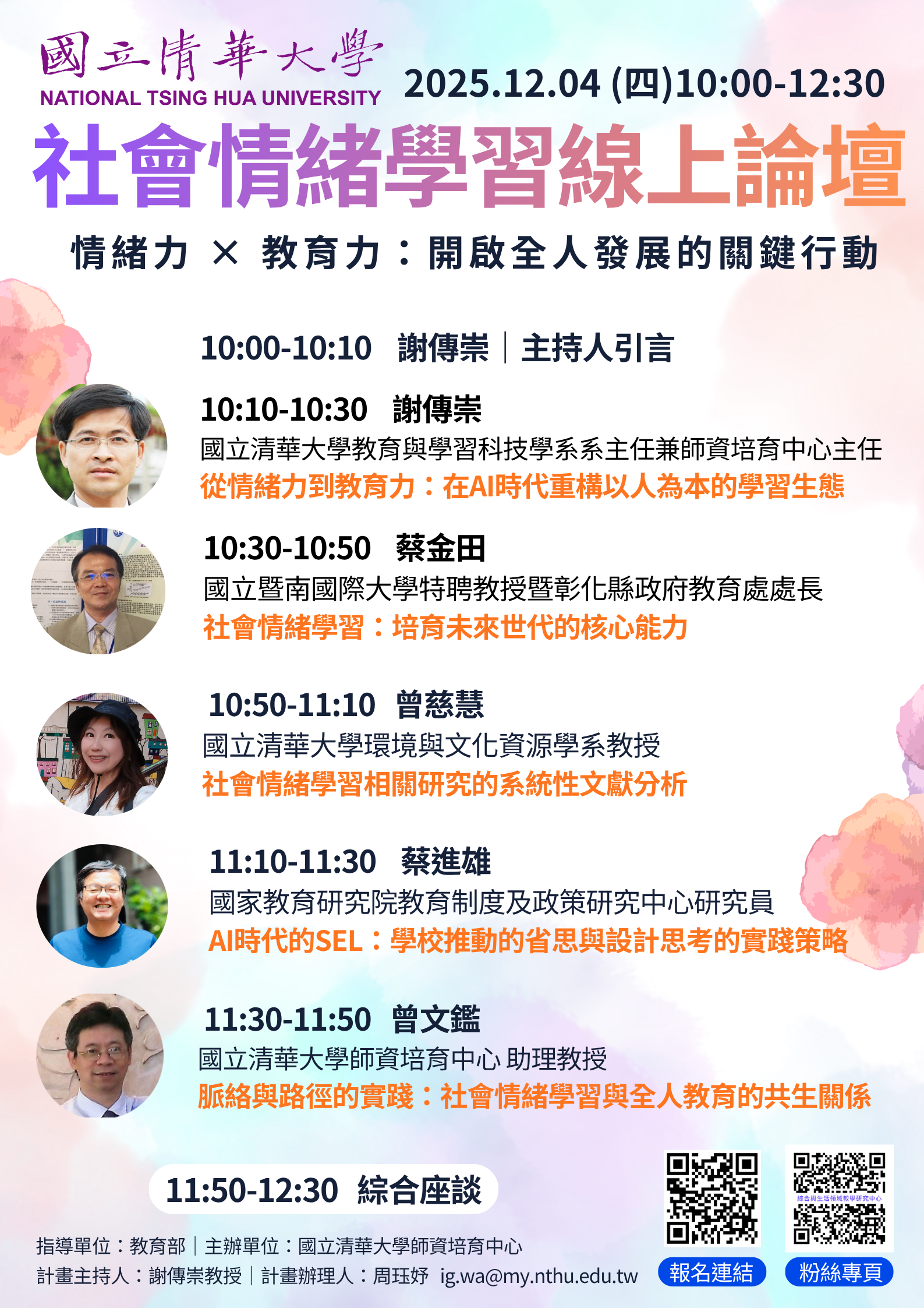 一、本次論壇以「社會情緒學習線上論壇-情緒力 × 教育力:開啟全人發展的關鍵行動」為主題,本論壇聚焦於社會情緒學習在教育領域的應用與發展,探討如何透過提升情緒能力,促進學習者在AI時代的全人發展,並分享相關研究成果與實踐策略,為教育工作者提供具體的行動方案與啟發。