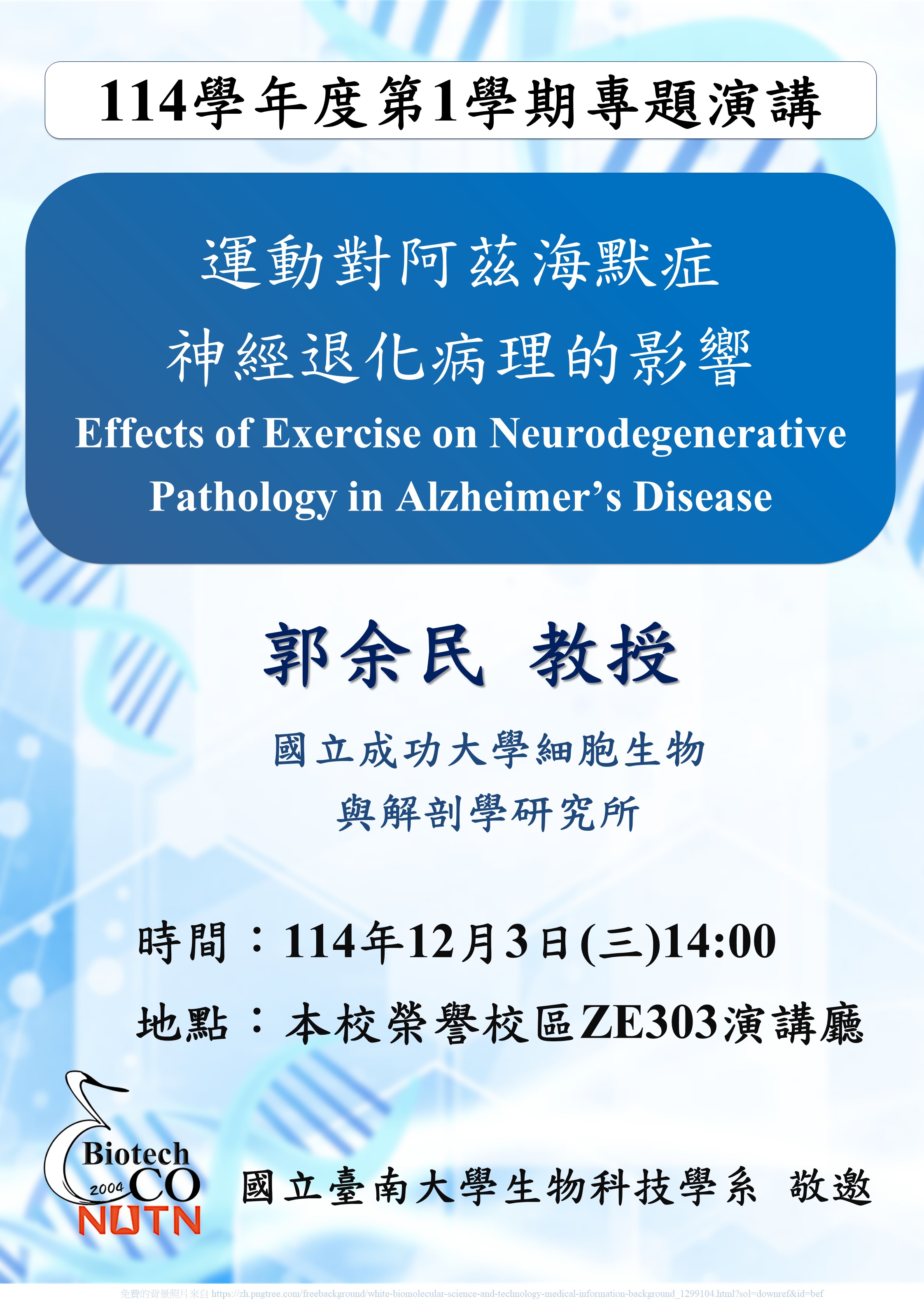 本系12/3特邀請成大解剖所郭余民教授,為同學進行專題演講,歡迎同學踴躍參加。