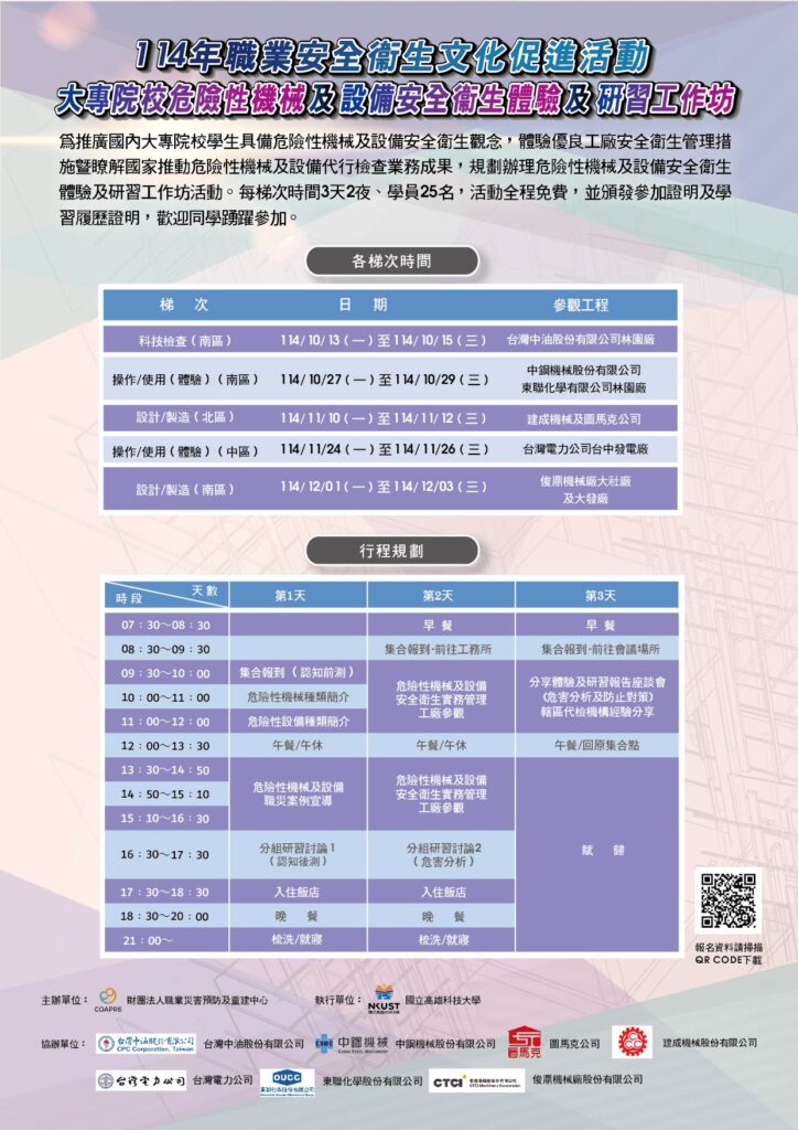 國立高雄科技大學承辦財團法人職業災害預防及重建中心主辦之「114年職業安全衛生文化促進活動-大專院校危險性機械及設備安全衛生體驗及研習工作坊」,每梯次營隊期程三天兩夜,全程免費。