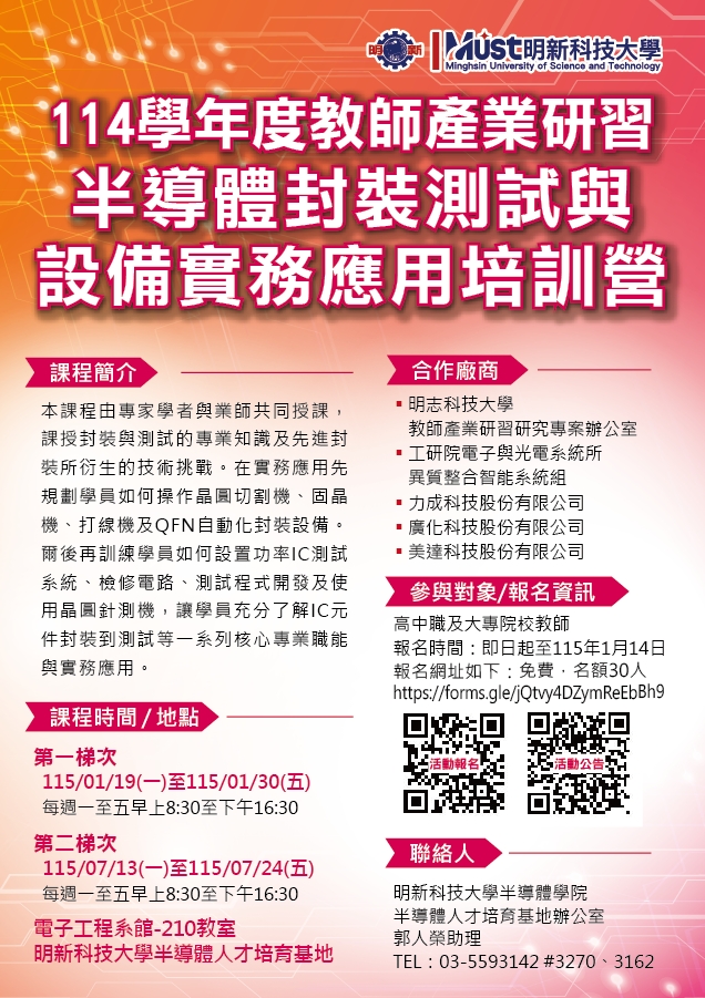四、報名洽詢:明新科技大學半導體技術中心辦公室郭人榮助理,電話:(03)559-3142分機3270、3162。